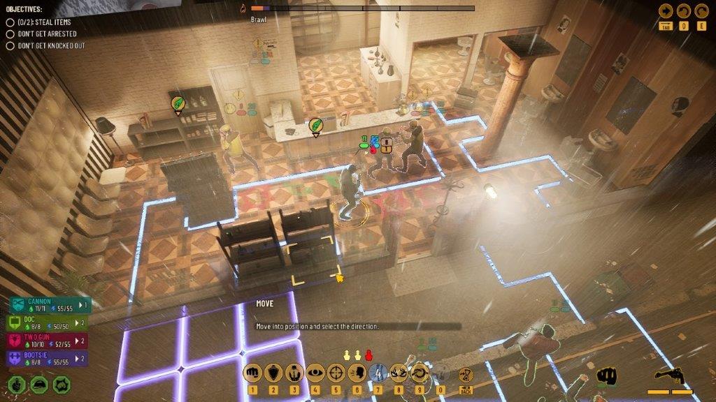 Kada udjete u prostoriju koju trebate “počistiti” kreće borba. Slično XCOM igrama, kretanje je podeljeno u dva segmenta. Prvi je dokle možete da se krećete i to je označeno plavim graničnikom. Posle birate akciju koju želite da izvedete. U igri je akcenat na borbi pesnicama, jer tako ne privlačite pažnju. Postoji veliki broj različitih poteza koje možete odraditi kako bi onesposobili neprijatelja. Bacanje o zid, šut u koleno, udarac glavom o sto i mnogi drugi, imaju za cilj da onesveste ali ne i da ubiju. Svaki lik poseduje određenu količinu energije i života. Udarci u nenaoružanom obračunu oduzimaju malo života i dosta energije. Ako koristite vatreno oružje, oduzimate dosta života neprijatelju i možete ga usmrtiti a u većini misija je bonus ako nema žrtava. Kod pozicioniranja važno je na koju ste stranu okrenuti, jer na taj način kontrolišete prostor ispred sebe.