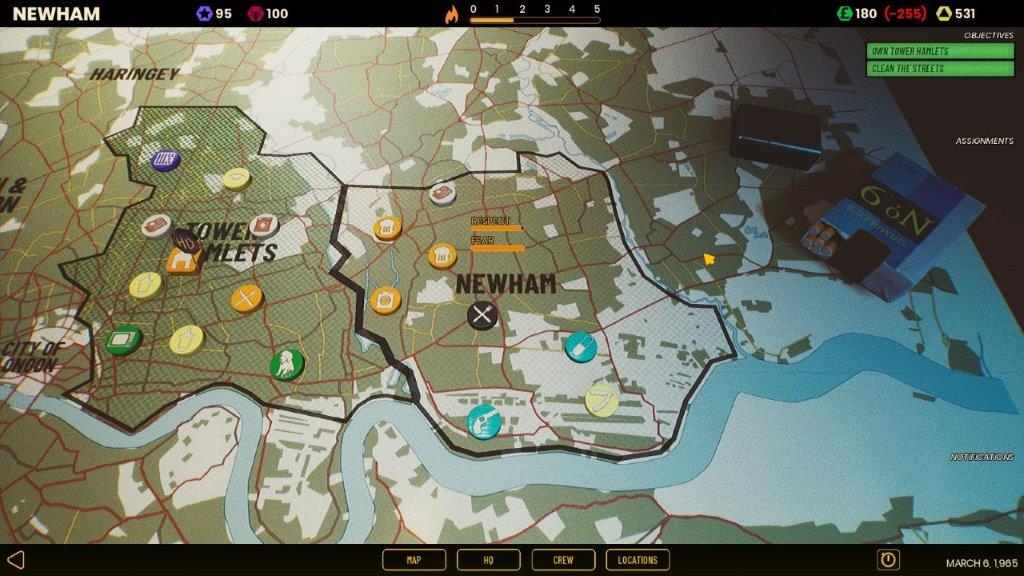 U početku krećete iz Newhama i u okviru tog rejona preuzimate poslove lokalnoj bandi. Kako uspešno završavate misije raste strah i poštovanje koje imate u tom kraju. Od ovih vrednosti zavisi da li možete da igrate neku misiju ili ne. Što se tiče tipova misija, možete pretući suparnike, kada raste strah i poštovanje. Ako preuzimate nečiji lokal, Opada poštovanje, ali dobijate više izvora prihoda. Novac vam je potreban za podmićivanje novinara, izbavljivanje ljudi iz zatvora, kupovinu oružja i plate.